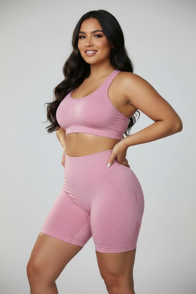 Designed for style and performance. Featuring a supportive sports bra with a stylish cross-back design and high-waisted shorts, this set provides the perfect blend of comfort and functionality. Crafted from breathable, stretchy fabric, it effortlessly moves with you, ensuring you stay comfortable whether you're hitting the gym or running errands. The soft pink hue adds a touch of femininity, making it a chic choice for any active lifestyle. Ideal for yoga, Pilates, or casual outings, this set is your new go-to for all occasions.